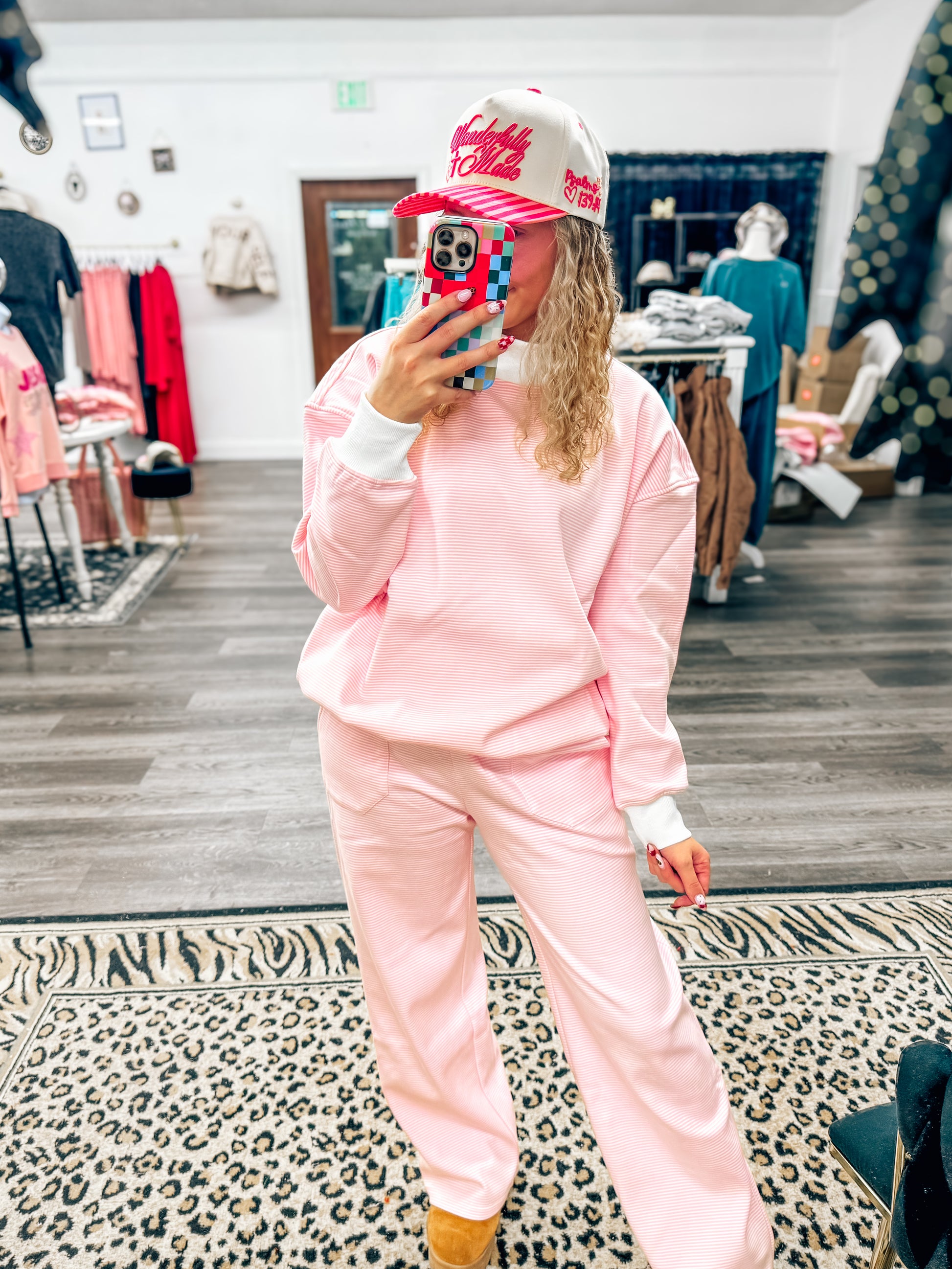 pink striped mock neck set